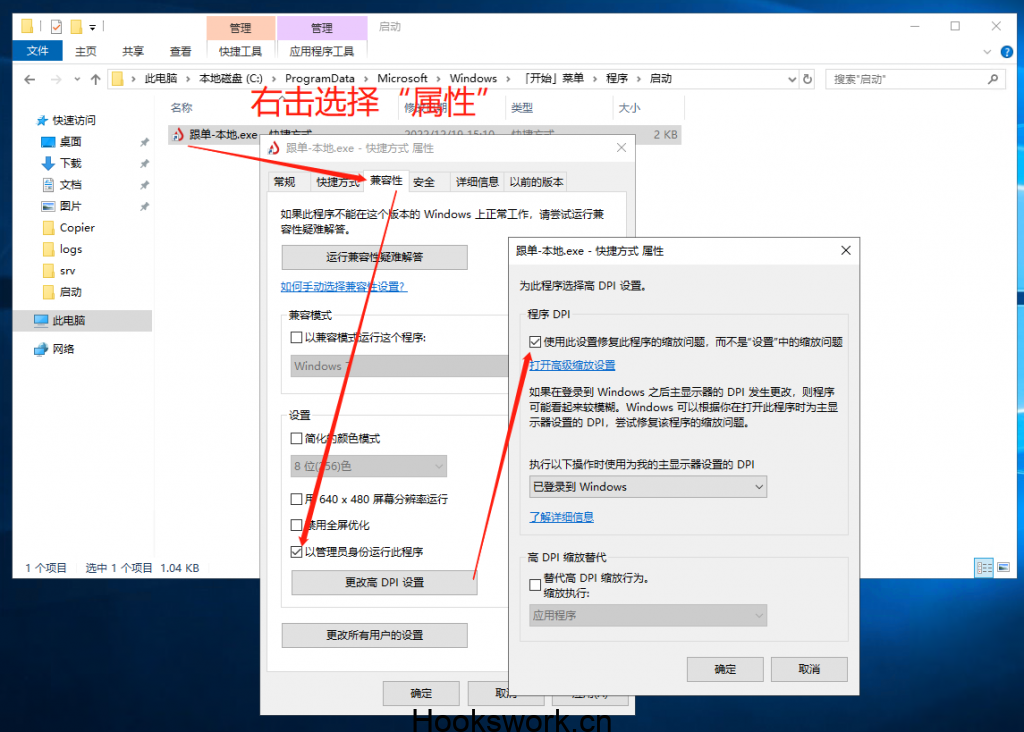 2)在”启动”目录中设置跟单软件的兼容性,右击跟单软件进行属性页面设置
