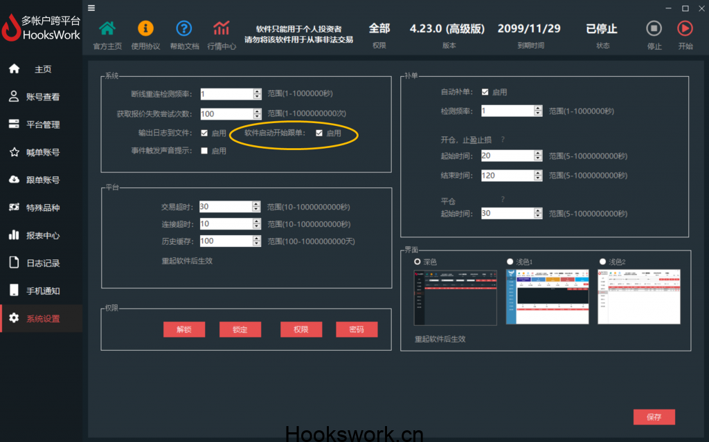 4、设置MT4跟单软件打开时,自动”开始跟单”,如下图。